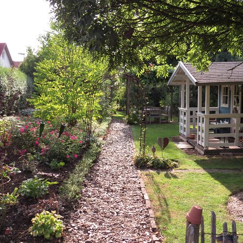 wunderschön ist dein Gartenhäuschen. Mit dem weißen Anstrich leuchtet die Veranda in neuem Glanz – wunderbar!